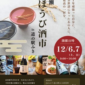 2025年11月18日 / 最終更新日時 : 2025年11月18日 道の駅みき 道の駅みき 12/6(土)~7(日) 年の瀬ごほうび酒市 1年頑張った自分に、お世話になったあの人に、最高の一杯を。 日時:12/6(土)~7(日) 9:00~16:00 会場:道の駅みき1階 階段付近主催・お問合せ:JAみのり TEL:0795-42-5144
