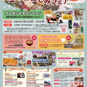 2025年11月25日 / 最終更新日時 : 2025年11月25日 道の駅みき 道の駅みき 12/7(日) 道の駅みき 冬のお楽しみフェア 道の駅みきでは、冬のお楽しみフェアを開催します。・店長のきまぐれ ふるまい汁・お米すくい・プレゼントキャンペーン・珈琲とスプーン藤井焙煎所(コーヒー・珈琲豆の販売)・味里(キンパ・チャプチェ・チヂミ等の販売)など、お楽し […]