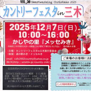 2025年12月1日 / 最終更新日時 : 2025年12月1日 道の駅みき かじやの里メッセみき 12/7(日) 第56回 カントリーフェスタ in 三木 カントリー雑貨・手作り家具、小物の展示販売 毎日の生活を彩るカントリー雑貨・ガーデン雑貨・花苗・布小物・木工品・アクセサリー・アンティークなどを販売します。お気に入りを見つけに、「メッセみき」へお越しください。 詳細 → […]