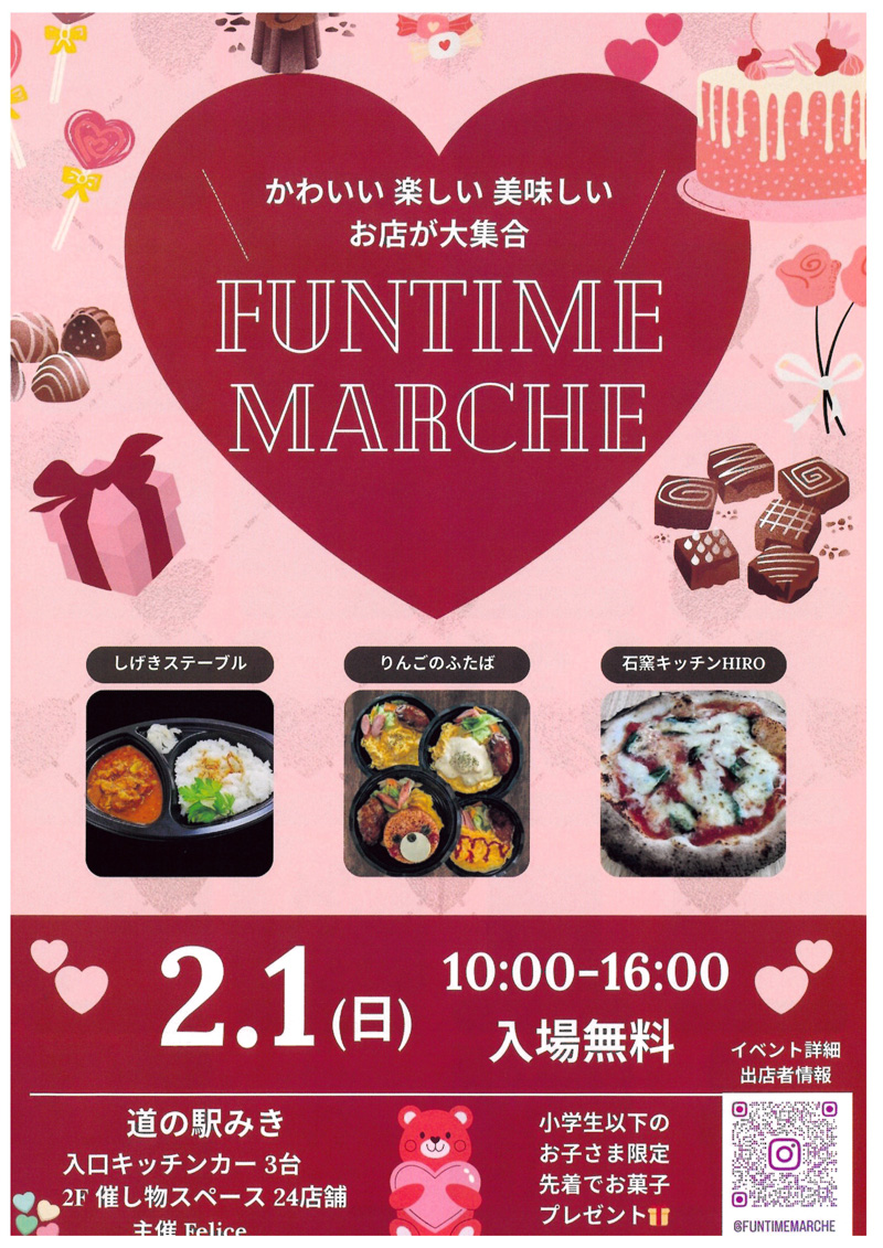 2026年2月1日 / 最終更新日時 : 2026年2月2日 道の駅みき 道の駅みき 2/1(日) Fun time マルシェ 終了しました 雑貨販売・ワークショップ・キッチンカーなど大集合! 日時:2026/2/1(日) 10:00~16:00会場:道の駅みき 2階 催事場及び駐車場キッチンカースペース主催:Felice. 詳細は コチラ ➡ インスタグラム FacebookX