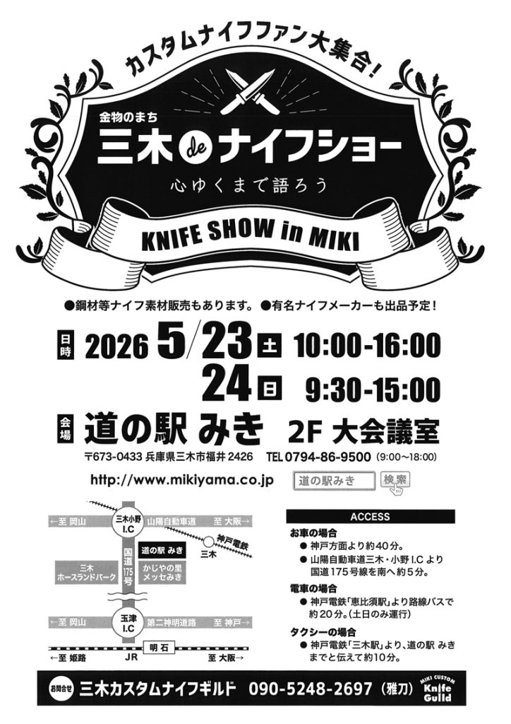 2026年3月26日 / 最終更新日時 : 2026年3月26日 道の駅みき 道の駅みき 5/23(土)~24(日) 三木 de ナイフショー カスタムナイフの展示会 日時:5/23(土) 10:00~16:00 5/24(日) 9:30~15:00会場:道の駅みき 2階 特設会場主催・お問合せ:三木カスタムナイフギルド TEL:090-5248-2697 FacebookX