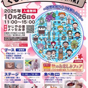 2025年9月22日 / 最終更新日時 : 2025年9月22日 道の駅みき かじやの里メッセみき 10/26(日) ぐるっとワールド in Miki ~世界を知ろう!体験しよう!~ 日時:10/26(日) 11:00~15:00会場:かじやの里メッセみき(道の駅みき隣接)〒673-0433 兵庫県三木市福井2426番地先主催・お問合せ:三木市国際交流協会 TEL:0 […]