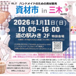2025年12月9日 / 最終更新日時 : 2025年12月23日 道の駅みき 道の駅みき 1/11(日) 資材市 in 三木 ハンドメイドのための資材販売・ワークショップ 手芸店では手に入らない資材、雑貨屋ならではの資材、1点もの、輸入商品、お買得商品など。手作りされる方への資材・材料を多種多様取り揃えております。お気に入りを見つけに、道の駅み […]