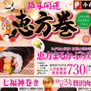 2025年12月30日 / 最終更新日時 : 2025年12月30日 道の駅みき ながさわ道の駅みき店 「令和八年 恵方巻」のご予約承り中です! 2月3日の節分は、恵方をむいて丸かぶり! 令和八年の恵方は南南東です。 1月31日(土)までにご予約のお客様にはご予約限定特別価格にてお買い求めいただけます。ぜひ、ご賞味ください。