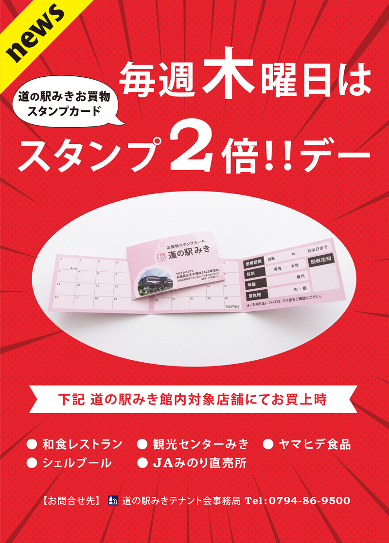 通常、レジ精算額500円(税込)ごとに「道の駅みきお買物スタンプカード」へのスタンプお一つ押印のところ、2倍の「2個」押しせていただきます。