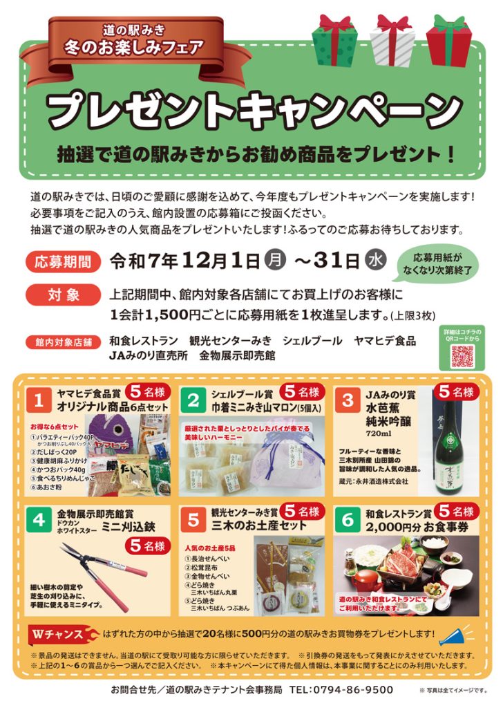 抽選で道の駅みきの人気商品をプレゼントいたします!ふるってのご応募お待ちしております。