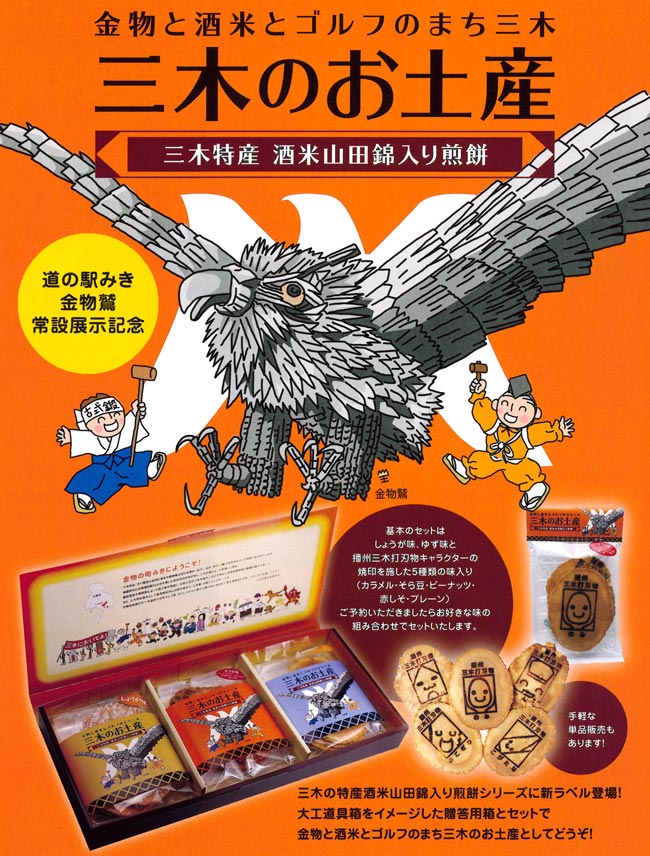 金物のまち みきのお土産に! 三木特産 酒米山田錦入りのおせんべいに、播州三木打刃物キャラクターの焼印を施し、そら豆入り・プレーン味・カラメル味・ピーナツ入り・赤しその5種類の味が楽しめます。