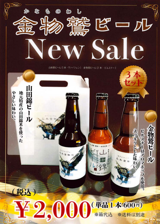 「金物鷲ビール」が新登場!! アロマホップを使用したスッキリとした味わいのピルスナーです。 金物のまち三木のお土産にいかがですか?
